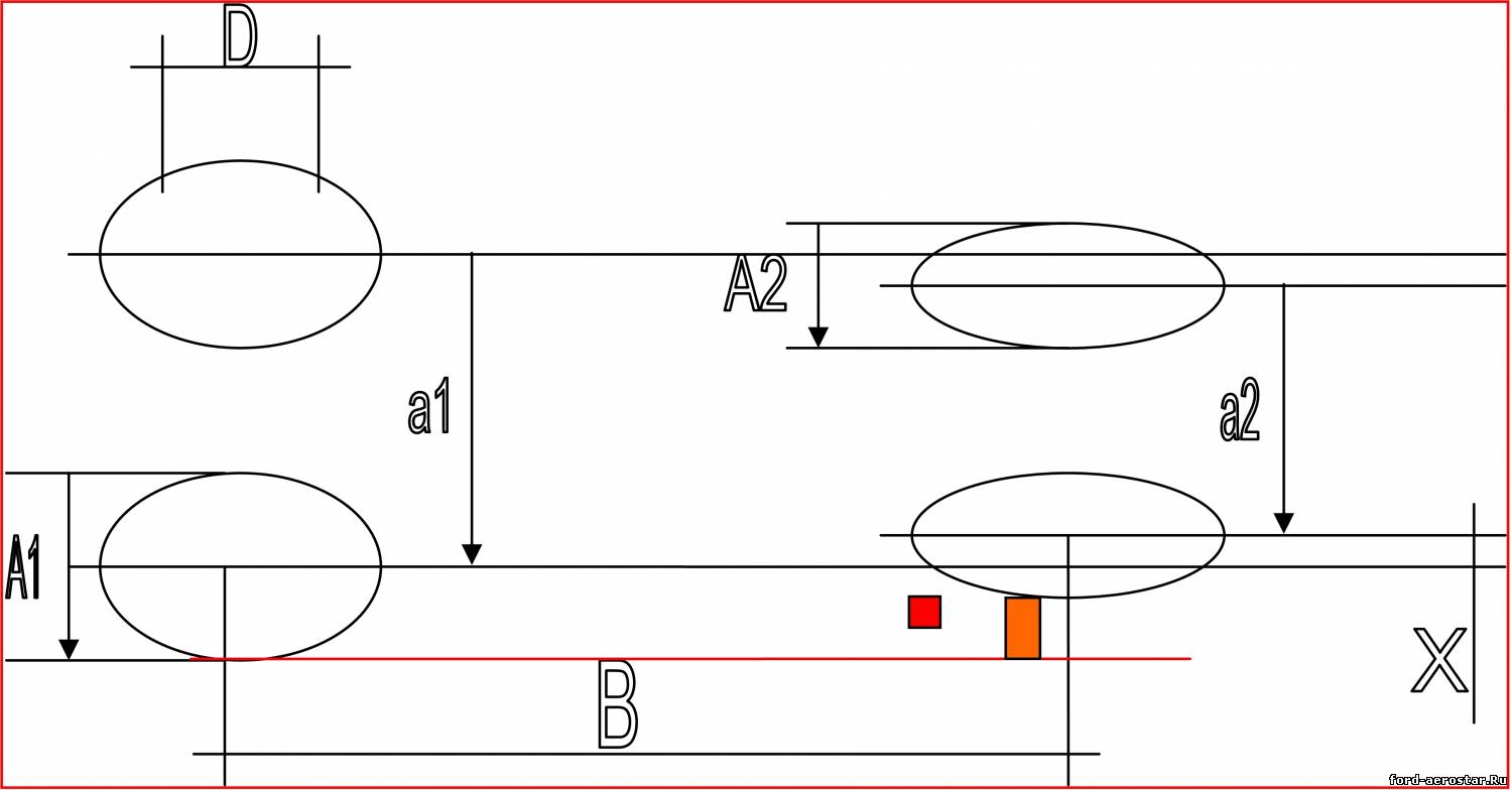 Теперь немного поясню. Берем линейку и прикладываем (легонько) к колесу по центру. В местах касания делаем отметки и измеряем (D ) Две рейки прикладываем с обеих сторон колеса и измеряем (А1 и А2). А2 нужно измерять если стоит разная резина, если одинаковая то (А1=А2) От ширины передней колеи(а1) отнимаем заднюю(а2), это (Х) База (В) дана. Схождение S- тож дано, для Аэростара (-1, +2), здесь нужно считать по формуле два раза, на (-1), а потом на (+2). Получим два значения в мм., это толщины брусков, на схеме красные, их два.